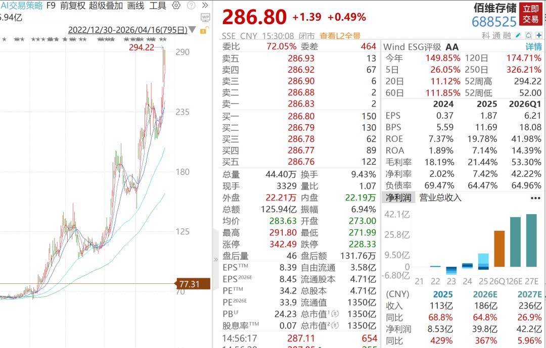 股价表现方面,截至4月16日收盘,佰维存储报收286.8元/股,总市值1350亿,今年该股大涨1.5倍,自2025年以来,该股涨幅近4倍。